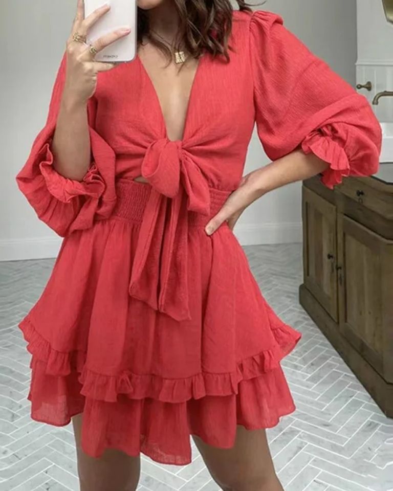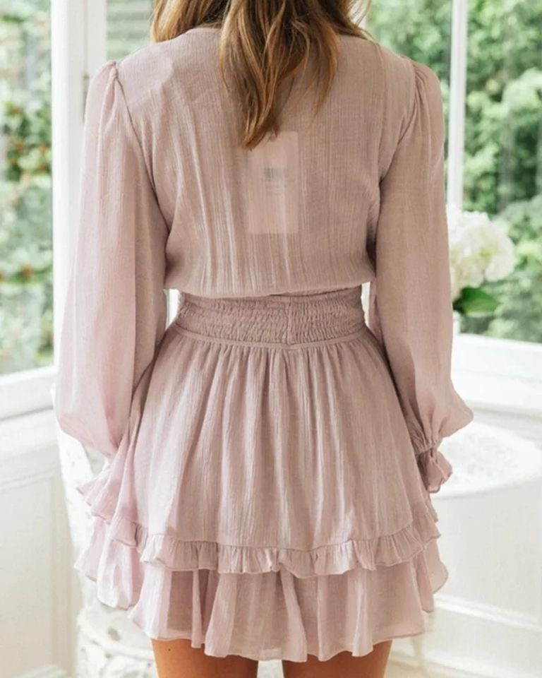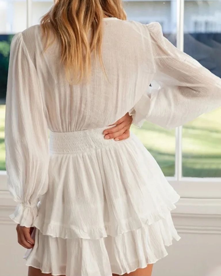 Cette mini robe trapèze captive par son imprimé floral délicat et son allure résolument féminine. La coupe A-line offre une silhouette fluide et flatteuse, tandis que les volants superposés sur le devant ajoutent du mouvement et du volume pour un effet romantique et ludique. Le col en V allonge le décolleté, et les manches longues apportent une touche d'élégance couvrante, parfaite pour les soirées d'été ou les journées de printemps. Légère et aérienne, elle est idéale pour un pique-nique, une sortie en ville ou des vacances, à associer avec des sandales plates ou des espadrilles.